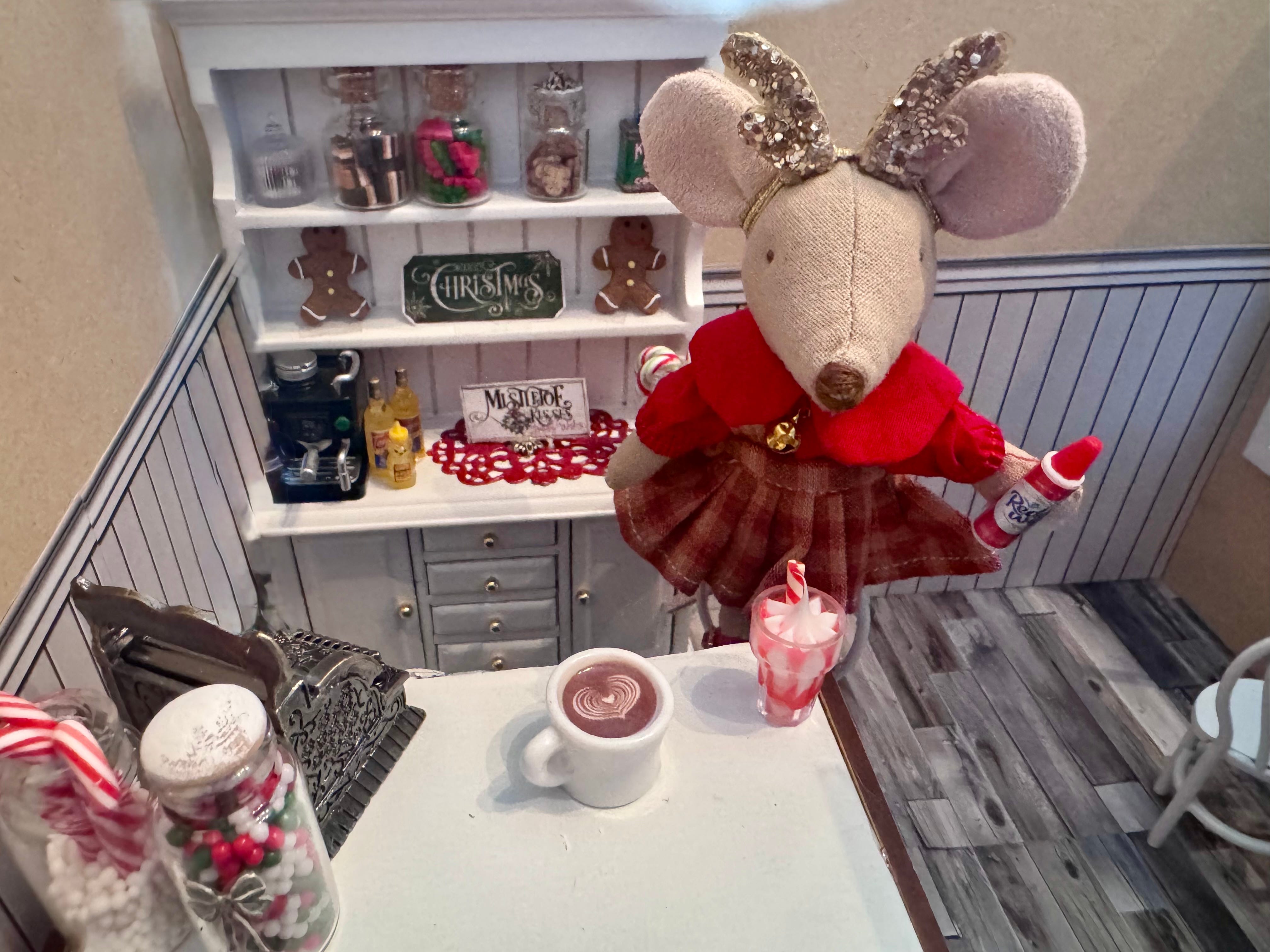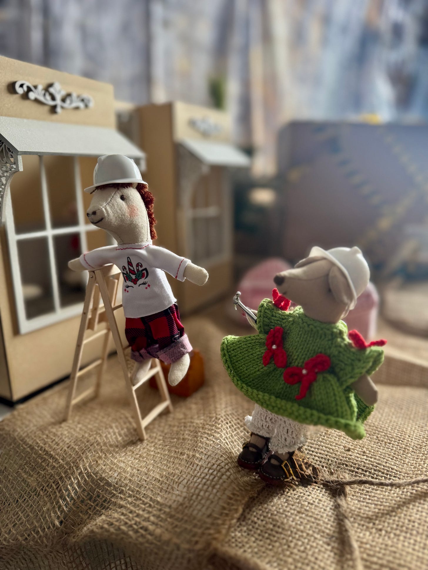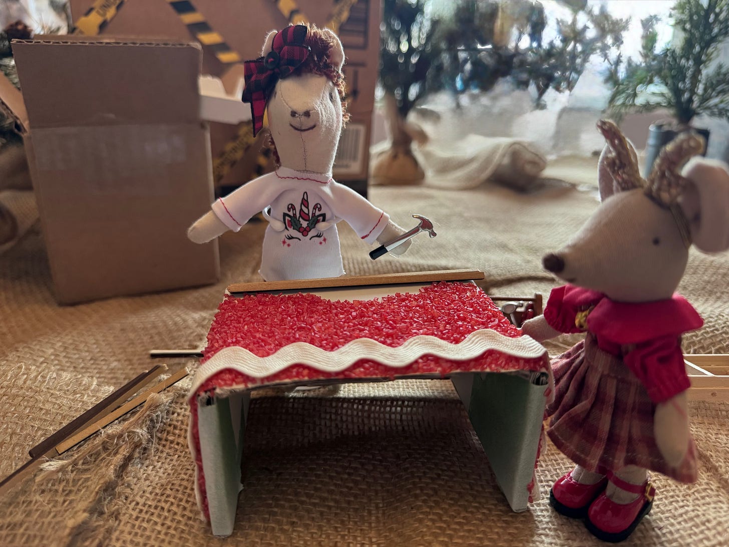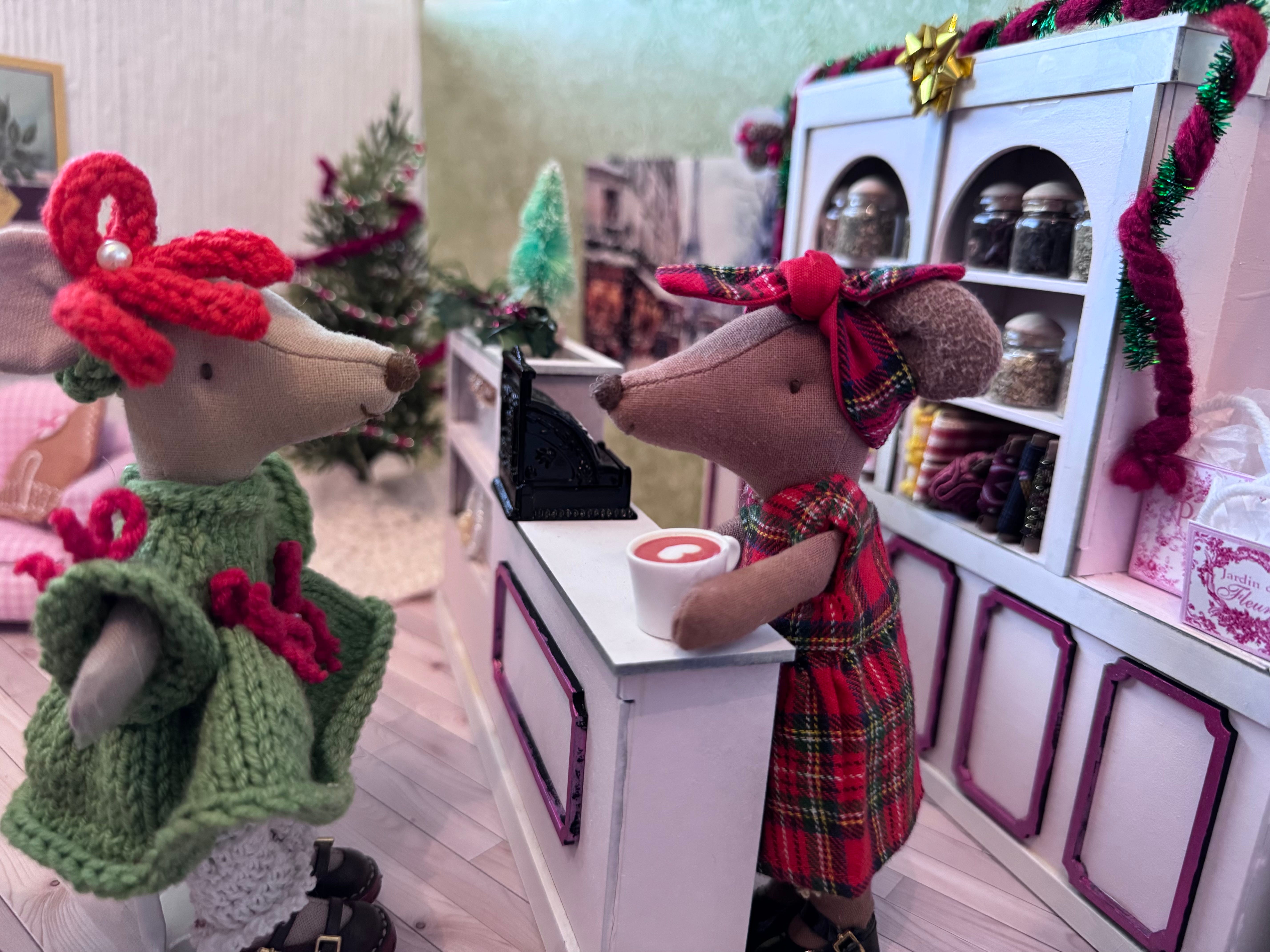We’ve been working claws and tails on Karamel’s coffee shoppe. I had to take a few days off to finish Christmas tasks at home, as being a house-mouse is very important during the holidays. But now that I finished the Christmas letter, baked cookies and made little gifts to go along with the cards…I’m back to work on the shoppe. Timbertale is finishing up the awnings.