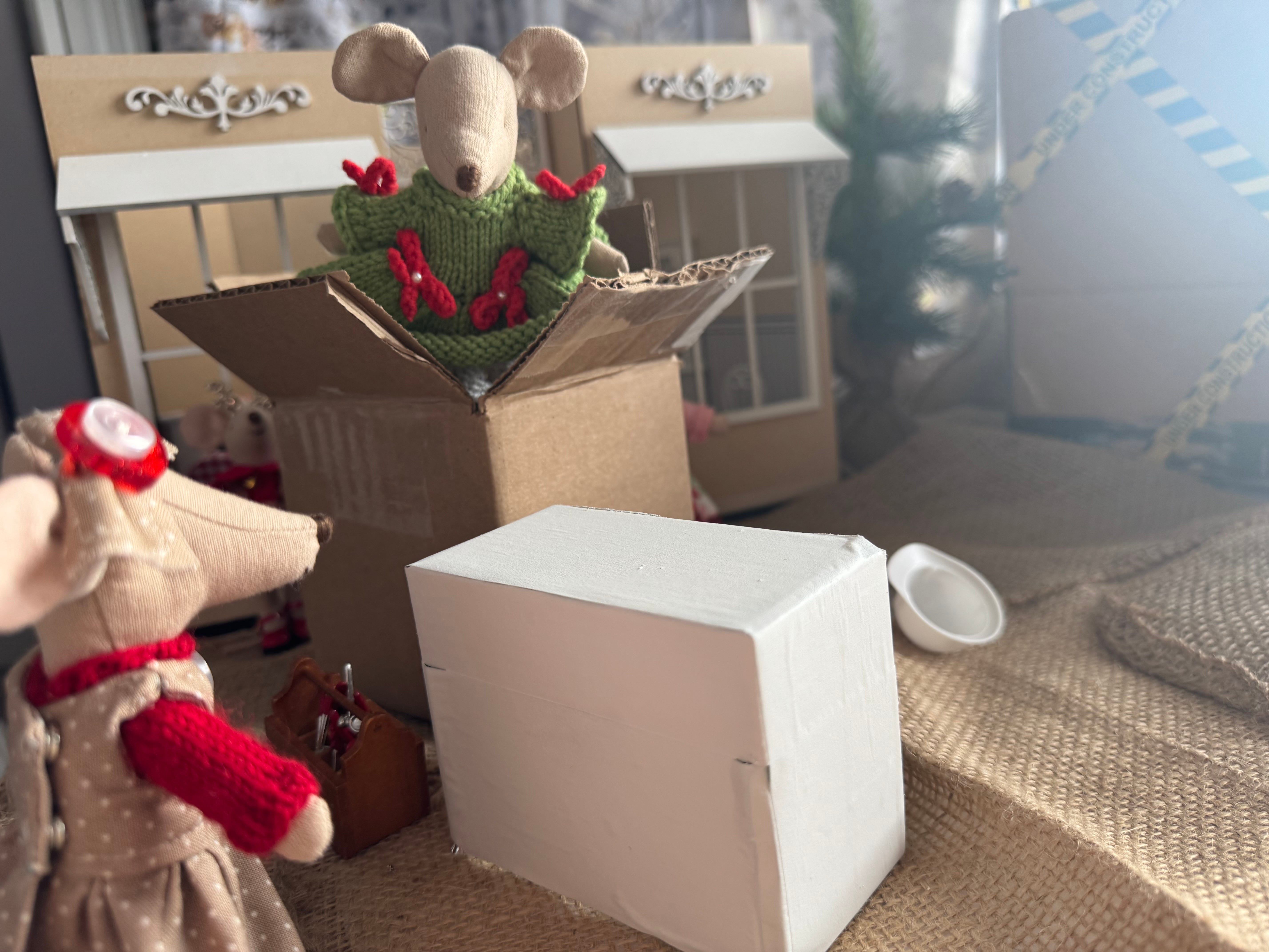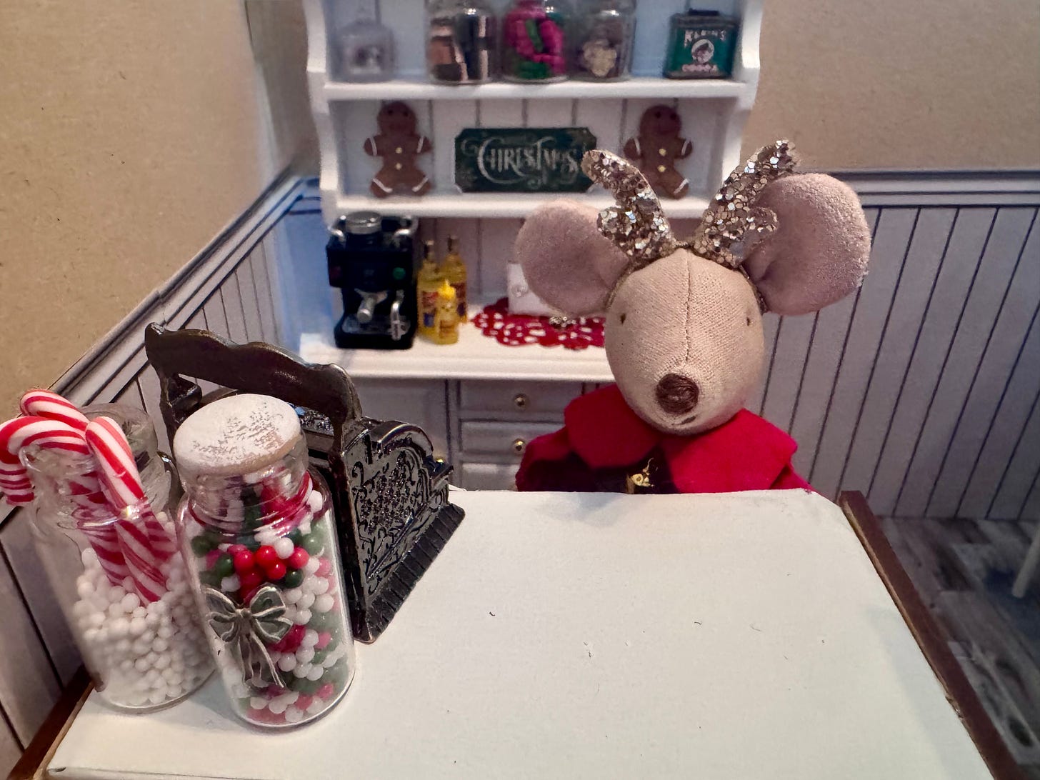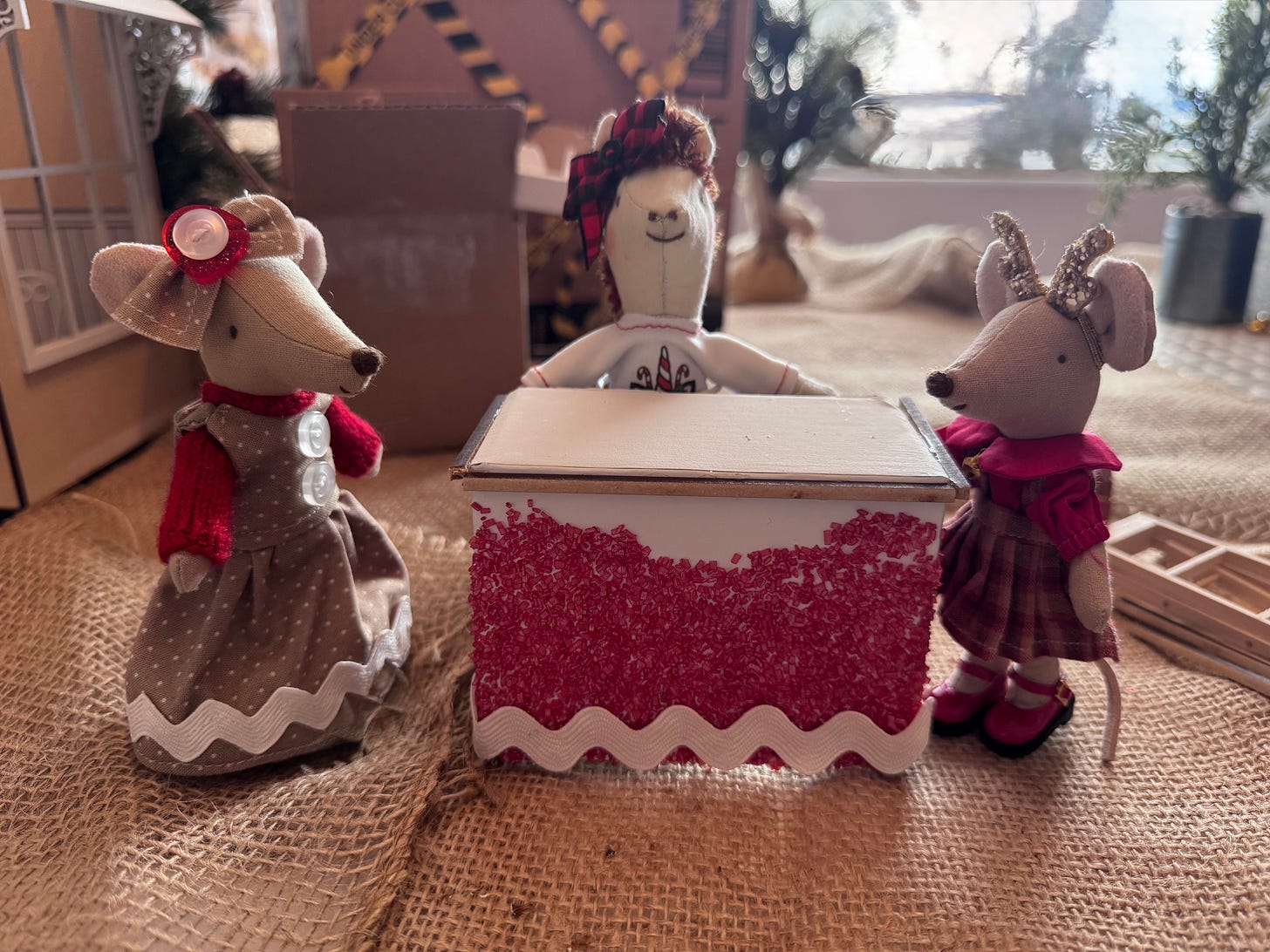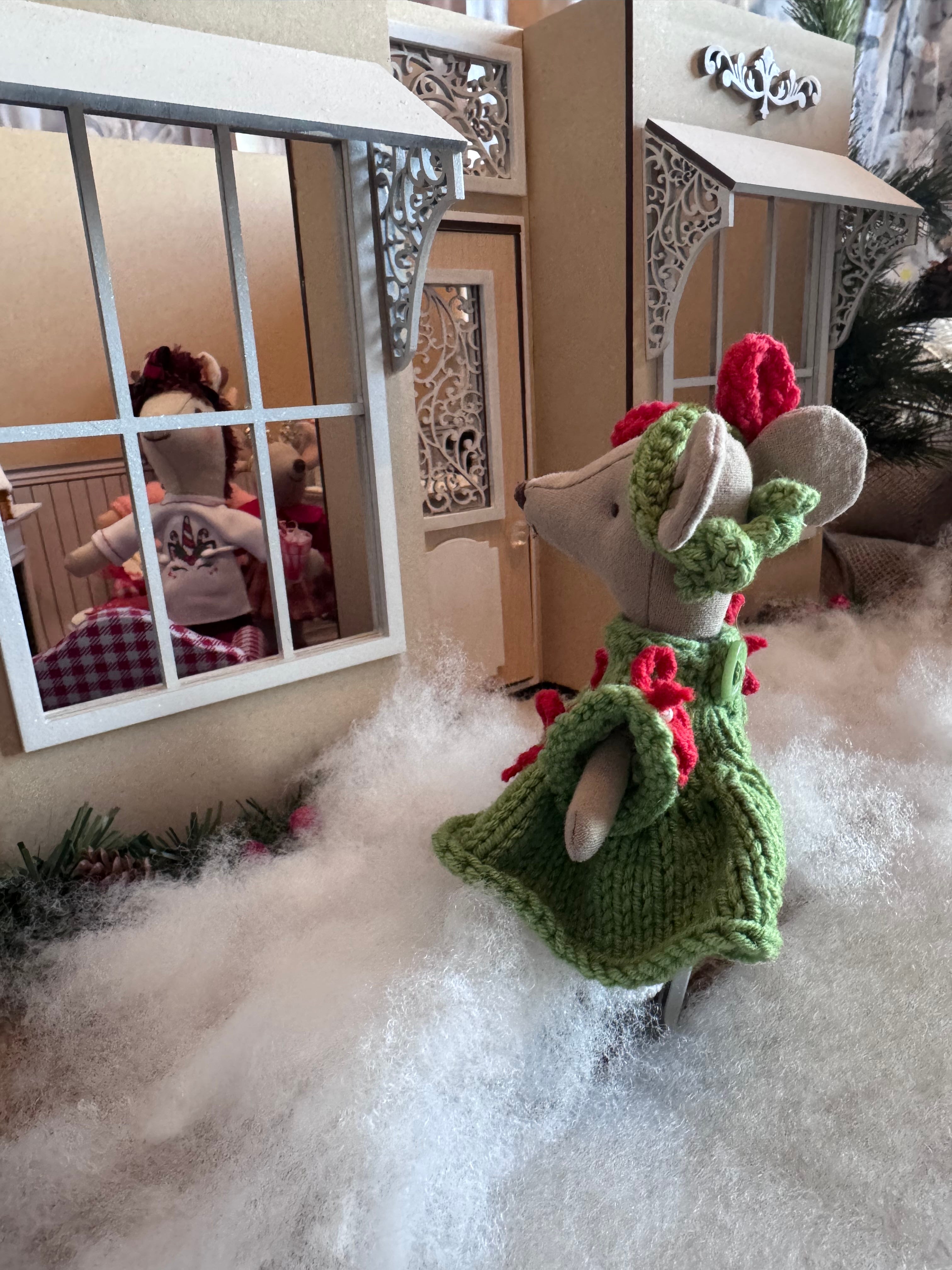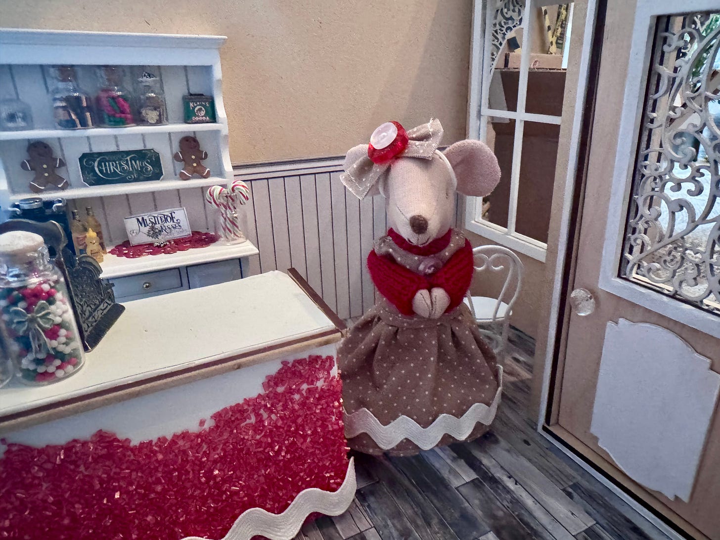 We’ve been working claws and tails on Karamel’s coffee shoppe. I had to take a few days off to finish Christmas tasks at home, as being a house-mouse is very important during the holidays. But now that I finished the Christmas letter, baked cookies and made little gifts to go along with the cards…I’m back to work on the shoppe. Timbertale is finishing up the awnings.