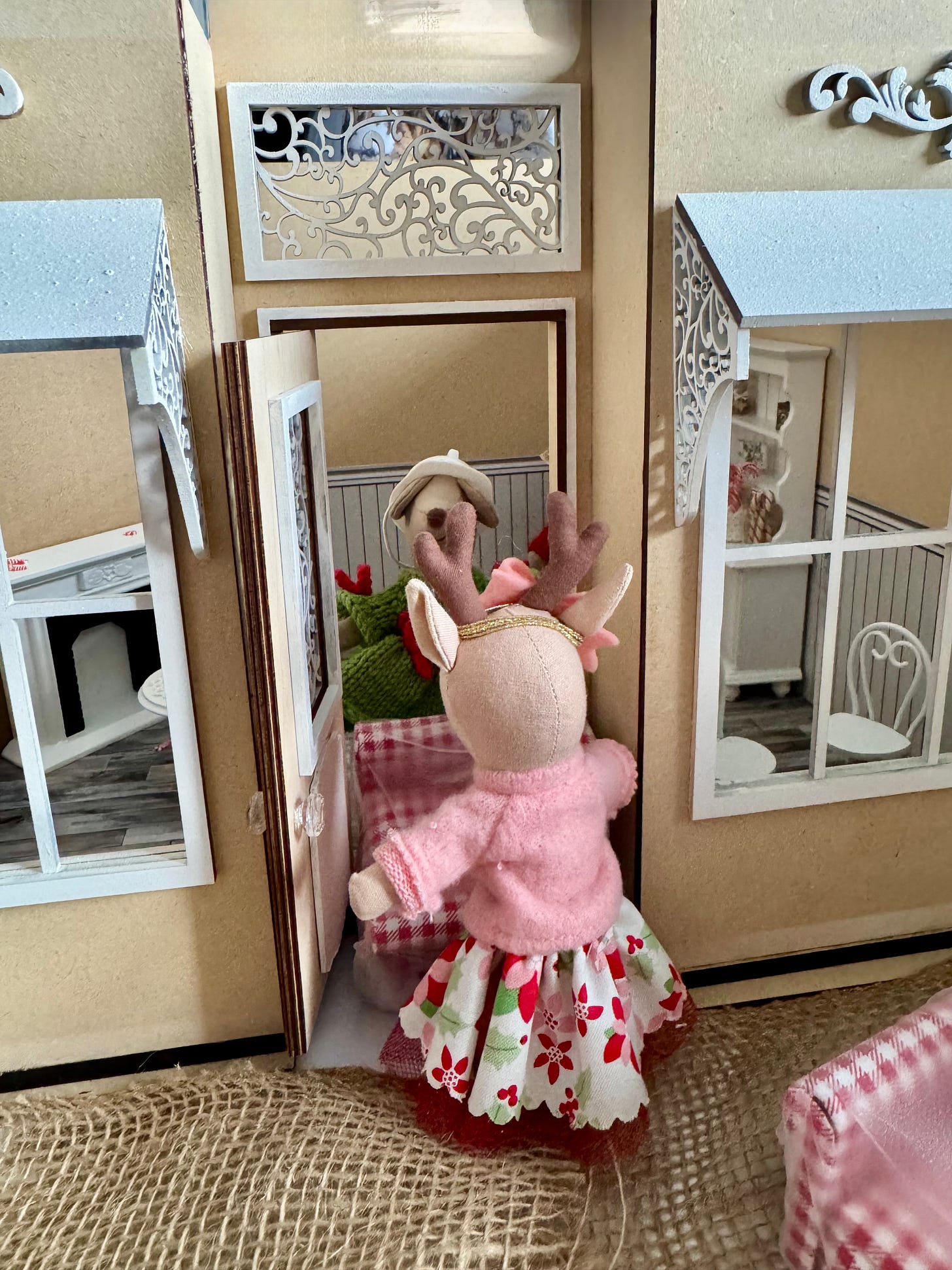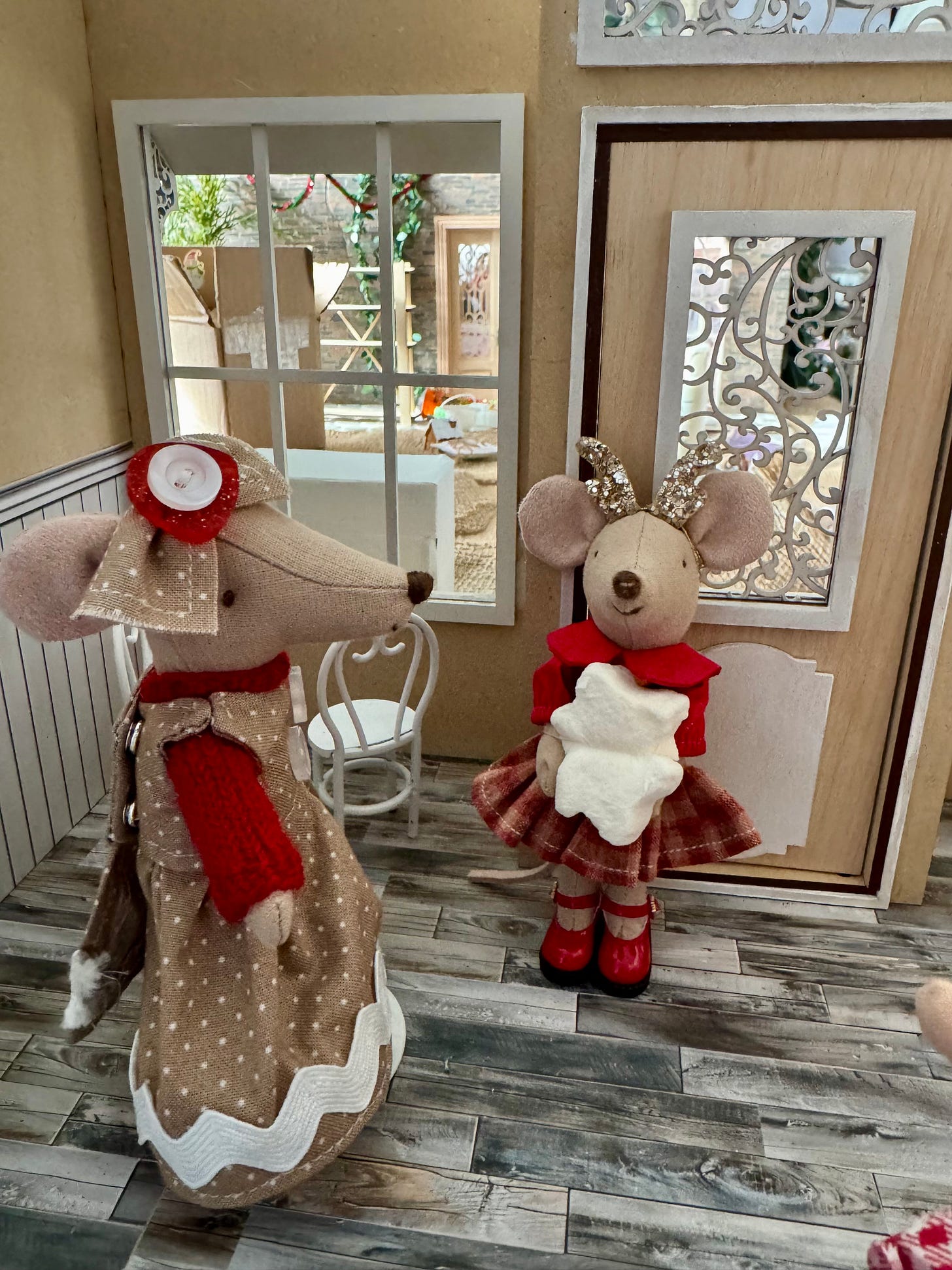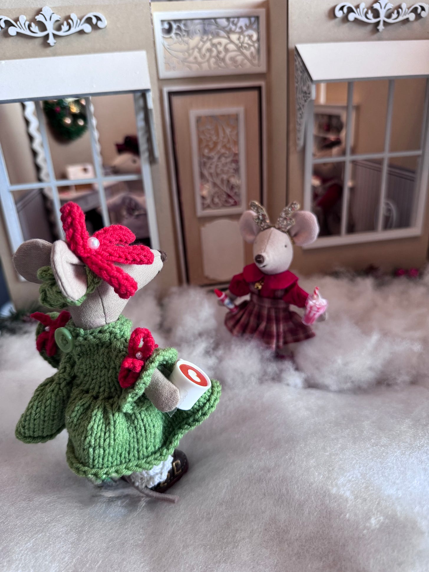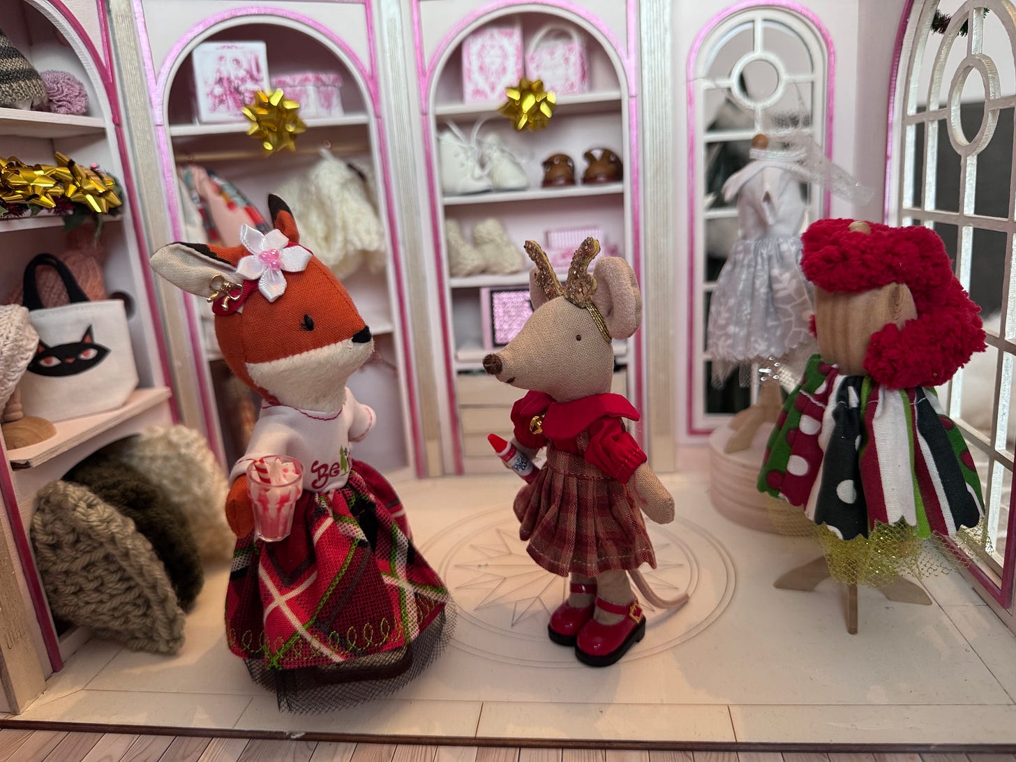 We’ve been working claws and tails on Karamel’s coffee shoppe. I had to take a few days off to finish Christmas tasks at home, as being a house-mouse is very important during the holidays. But now that I finished the Christmas letter, baked cookies and made little gifts to go along with the cards…I’m back to work on the shoppe. Timbertale is finishing up the awnings.